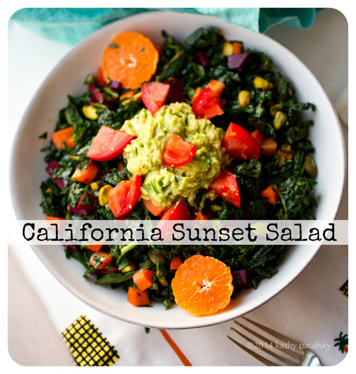 The goodies? Finely chopped organic dinosaur kale, diced organic carrots, diced organic red beets, chopped pistachios, apple cider vinegar, sweet agave or maple syrup, lemon juice, diced tomato, fresh guacamole, satsumas and a few spices too. Warm black/purple rice on the side boosts the oomph of this salad a bit. Even more oomph? Add some cooked beans, tofu cubes, skillet-popped lentils or tempeh bacon slices. Get my California Sunset Salad recipe ahead...