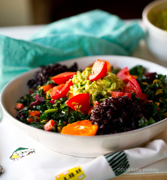 This fresh-from-the-organic-farmer's-market salad is packed with healthy goodies. Everything is heavily chopped using a sturdy chef's knife. The kale shredded into skinny slices that are ready to absorb lots of flavor, the beets cubed and chopped into tiny crunchy bits and the carrots diced too. This is a chop-chop-chop chopped style salad. It is lightly dressed and easy to make. The light and lovely flavors are energizing and cleansing. Each bite is bursting with vitamins A and C, iron, fiber, calcium, protein and plenty of sunshine. A generous dollop of fresh guacamole of top, some antioxidant-rich purple rice too. This Sunset Salad will have you daydreaming of dinnertime.