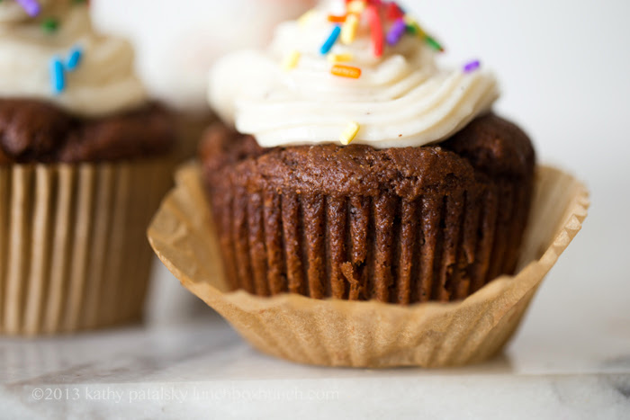 Back to Things. My first recipe back is a tribute to miss Nelly cat. Fluffy dark chocolate cupcakes swirled high with silky cream cheese vanilla bean frosting, rainbow sprinkles on top. Black and White Tuxedo Cupcakes. The funny thing is that I made these cupcakes early last week, and I was going to call them "Celebration Cupcakes." But now feels like the perfect time to post them, and give them a tuxedo cat title in honor of Nelly...