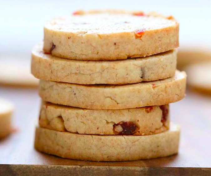 "My Mom had a favorite bakery while growing up and she would always get shortbread type cookies that had candied fruit in them every holiday season. These are my vegan version with candied papaya and pumpkin pie spice."