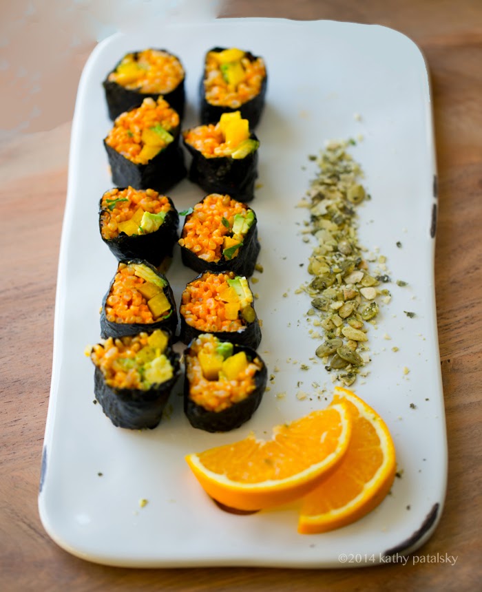 - Tightly roll the nori into a burrito shape with open ends. Let it sit for at least two minutes before slicing. Slice roll into one inch thick rounds and turn on their sides to arrange the rice facing up. Serve with tamari, wasabi and ginger if desired. Or just a few orange slices. Pumpkin seeds: you can sprinkle these over top the rolls, along the side or inside as desired.