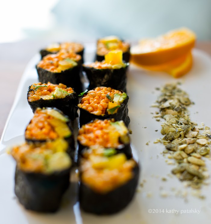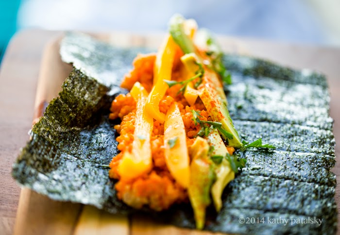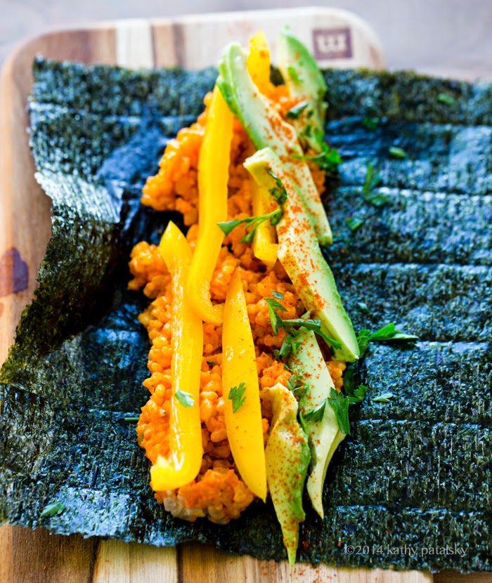 Rice: The rice is an important part of sushi since it is the glue that really hugs all those veggies and filings together. Traditional sushi rice is made using white short-grained "sushi rice" and accented with rice vinegar, a hint of sweetener and salt. For my untraditional sushi rice, I would by default use brown rice and add a splash of seasoned rice vinegar, maybe a few drops of sesame oil too. But for this recipe I put my creative hat on and added some spices and citrus. Again, sushi is so much better when you get creative!