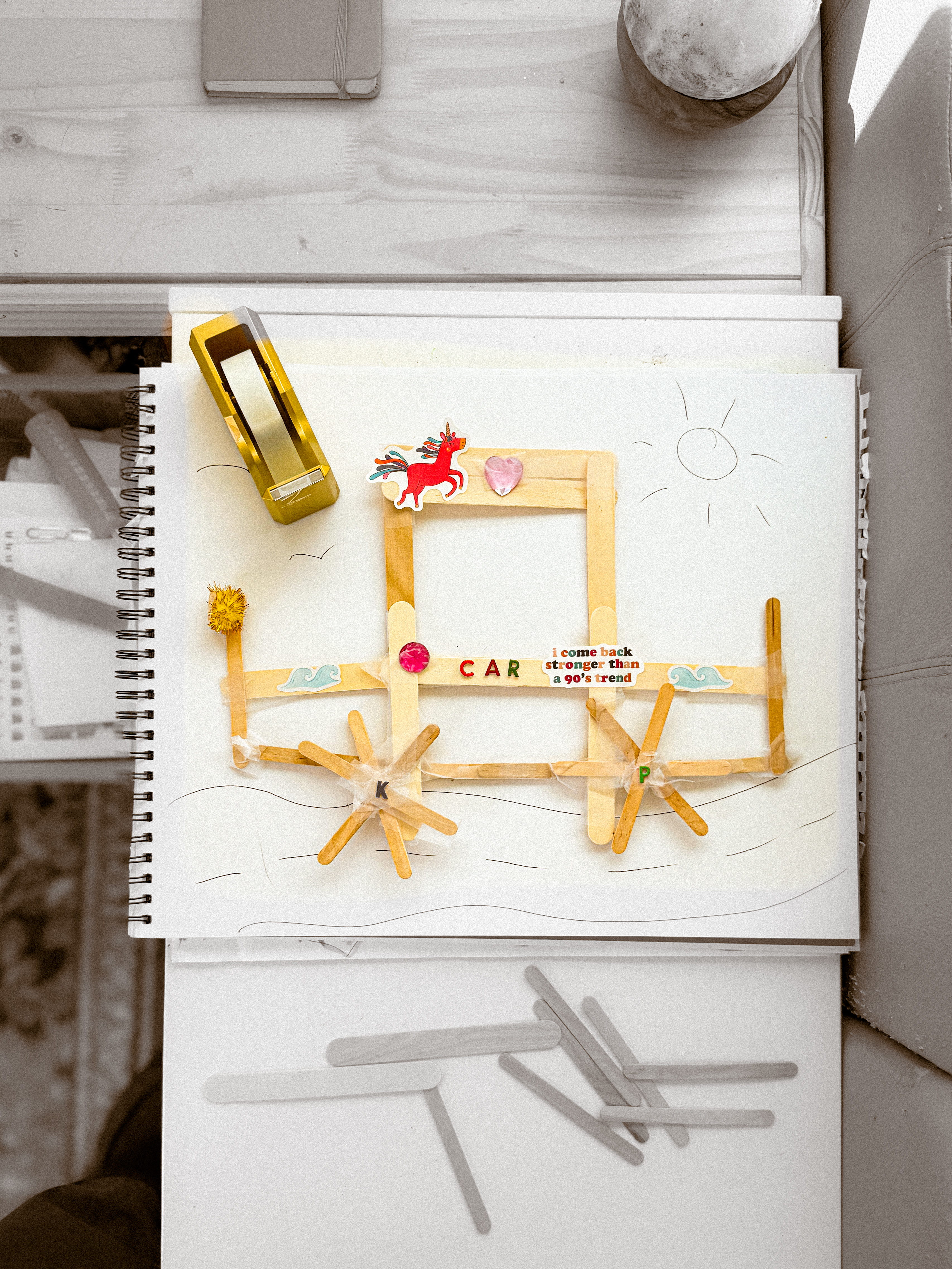 Not a real one. This one’s made out of popsicle sticks and tape from my kid’s craft station. It’s wobbly. It squeaks. It probably isn’t road legal. But it’s mine.
