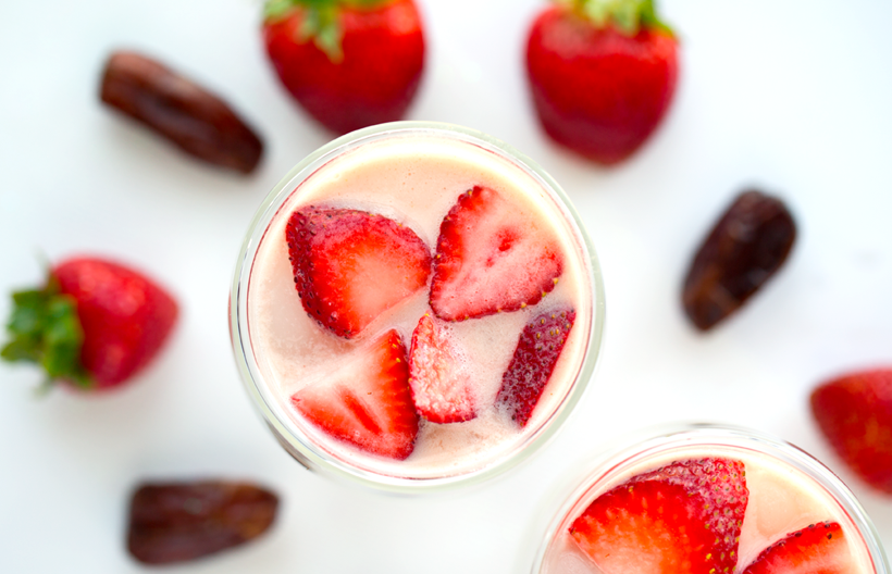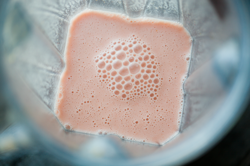 - Add the non-dairy milk, dates and pink fruit to a blender.