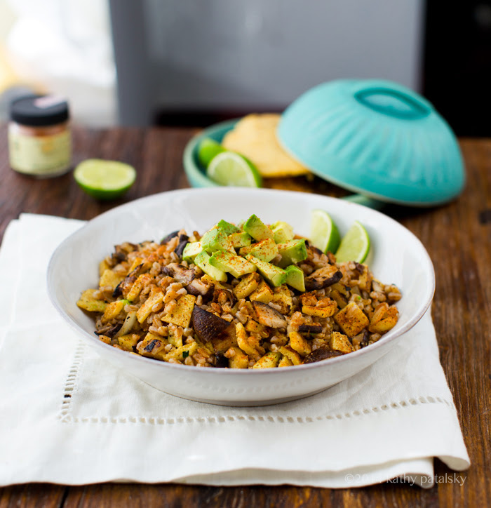 5. Squeeze the juice of one lime into the farro bowl, and add the parsley or cilantro - then fluff the farro very well. Next, pour the warm mushroom mixture into the farro bowl and toss again. Lastly, dice up 2-3 of the cooked tortillas and add to the farro bowl. Toss together very well. Add more seasoning to taste. Pour salad into serving bowl(s). Dice avocado and add to top of salad. Garnish with fresh lime. This salad can be served warm, freshly tossed, of cold after chilling in the fridge. Salsa of hot sauce over top. You can serve any leftover tortillas as sides.