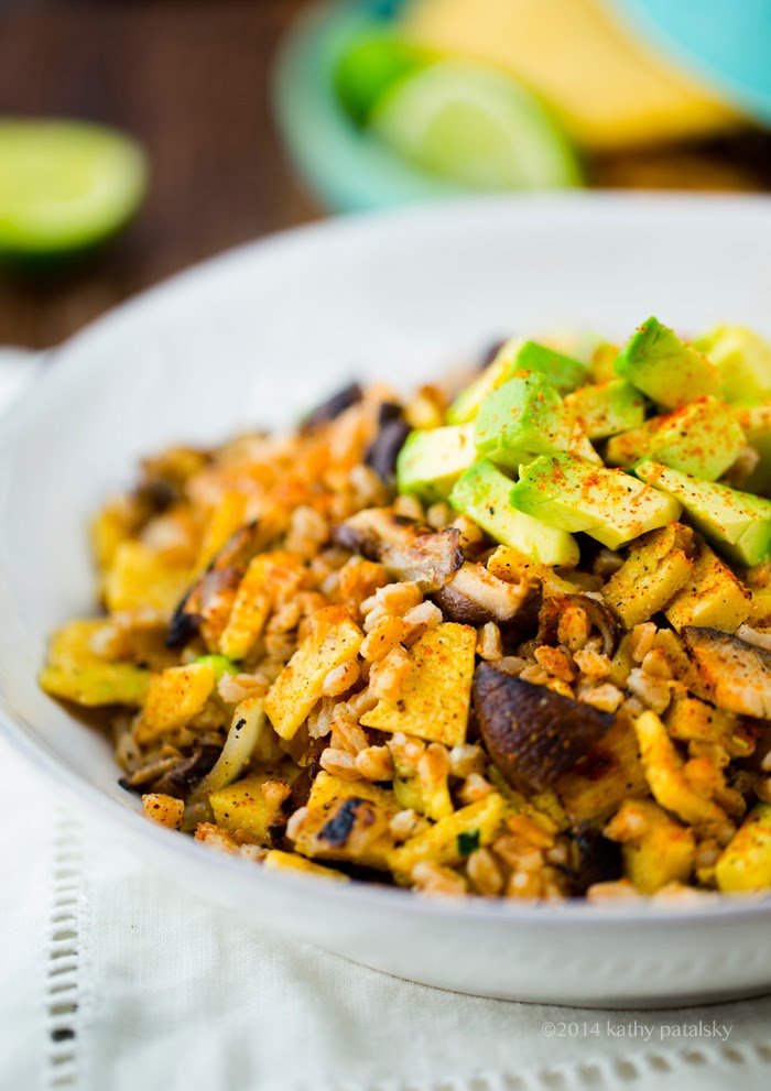 Tortilla Salad. Recipes first, always! (And my big news follows the recipe.) So, you know how everyone loves tortilla soup? Well this is tortilla salad. Made using just a few fantastic ingredients including homemade corn tortillas, sizzling shiitake mushrooms, tender rustic farro, fajita spices and zesty lime juice. Avocados on top! Try this yummy fusion recipe out, the flavors are so simple, yet so wonderful all blending together in a big festive bowl..