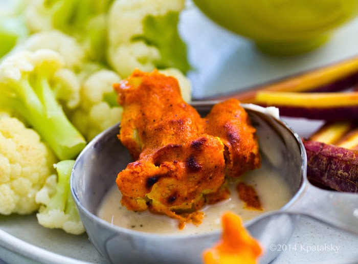 Snack on veggies with this fun and tasty way to serve up cauliflower. Bite-sized cauliflower florets are coated in my spicy creamy sauce, then quickly cooked in the oven to blackened perfection. Healthy meets delicious in each warm and lively bite. Add a cool ranch (vegan!) dipping sauce on the side, a pile of freshly sliced veggie sticks and happy snacking time is ready! These "buffalo wing" inspired bites are perfect for vegging out in front of your iPad or paired with some "me time" watching Netflix or browsing a good book or cookbook! (There are soooo many vegan cookbooks, like this one, out or coming out this year, I need a bigger bookcase!) This recipe would be fun for parties too, simply add a toothpick to each bite and serve! The bright red-orange color looks so pretty against a green tablecloth or napkin. Grab a head of cauliflower at the store or farmer's market and make my Spicy Blackened Cauliflower Bites!..