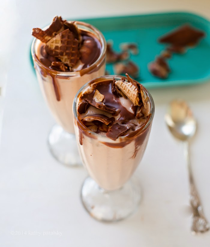 - Pour the shakes. Drizzle generous amounts of the leftover chocolate sauce on the shake and into the glass. Garnish with the chocolate covered cone bits on top. Yes you will have leftover cone bits, but they are delicious for nibbling alongside your shake or store them in the freezer and save them for later.