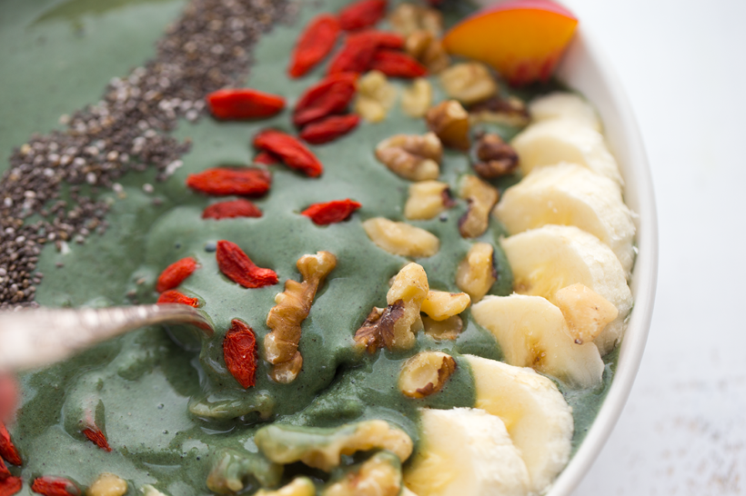 breakfast: Green Dream Smoothie Bowl --- Dreamy green smoothie bowl, sweet banana flavor. Use your fave protein powder or snag some Philosophie Green Dream which is just my fave.